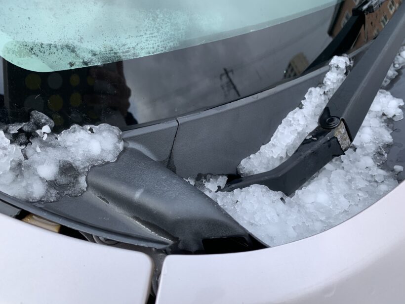 車に乗ろうとしたら、びっくりしました!!雪!?いや雪はまだだろうから、テレビで言ってたヒョウかな!?