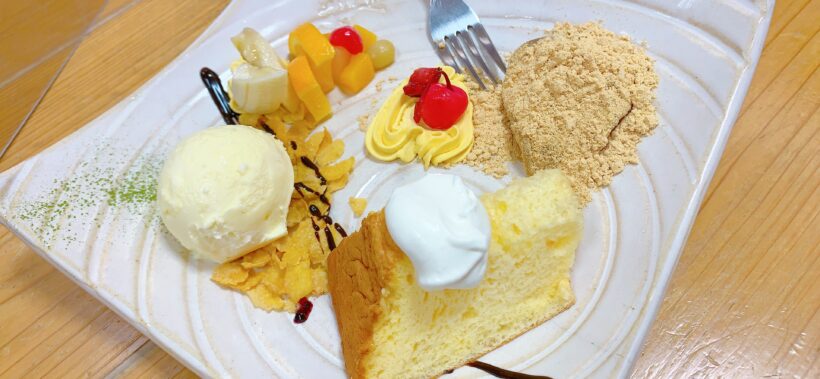このデザートプレート何が乗ってるかと言うと、シフォンケーキとバニラアイスとコーンフレークとフルーツポンチとわらび餅とバナナとお芋のクリームが乗ってます。