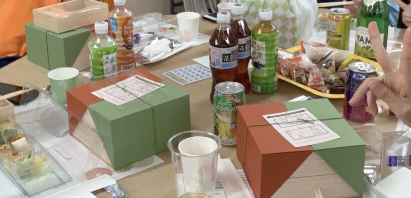これは新年会の私が座ったテーブル(開始前)。2段のお弁当が見えます!!