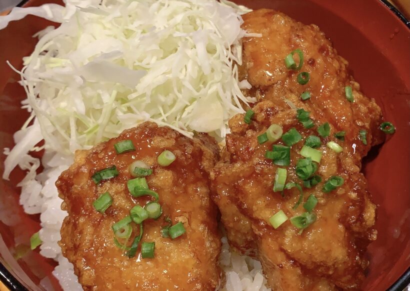 甘いタレのかかった唐揚げ丼。カリカリ。