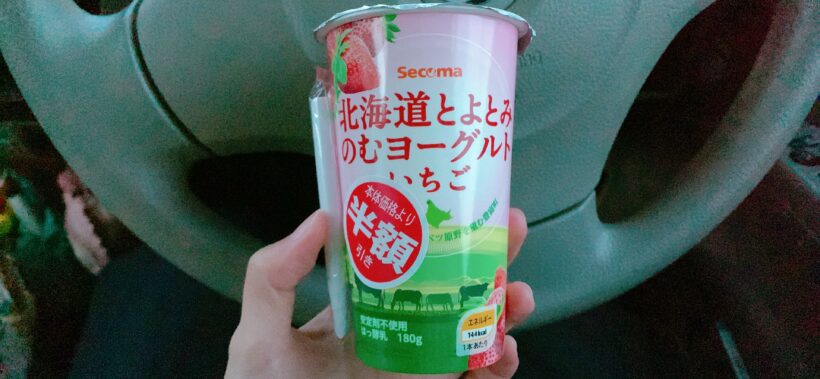いちごの飲むヨーグルト、まあいちごミルクだよね。半額でかなりおやすくなりました(-人-)ありがたやー。
