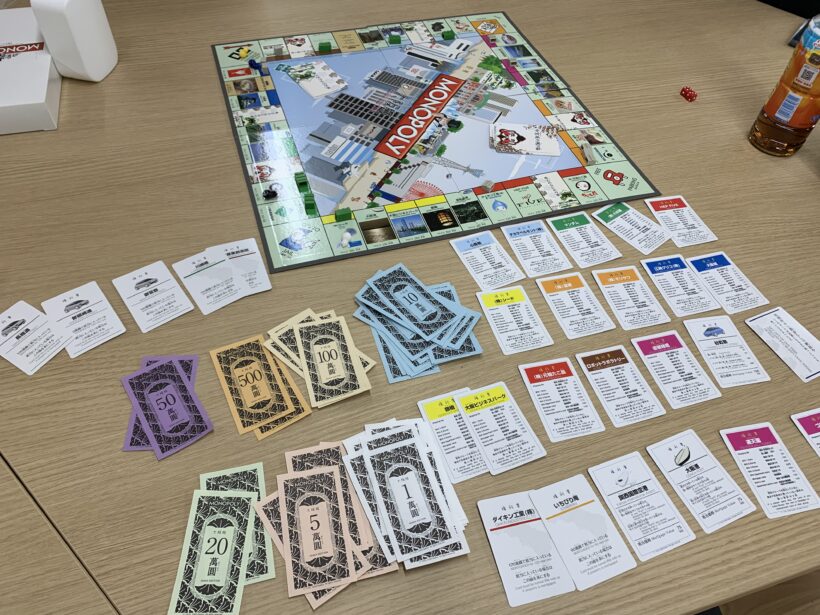 サイコロ2つ振って、すごろくを進めていく。すごろくの盤面には、会社の名前が並んでいてそのマスに止まると手持ちのお金で買うか選べる。そんな感じ。