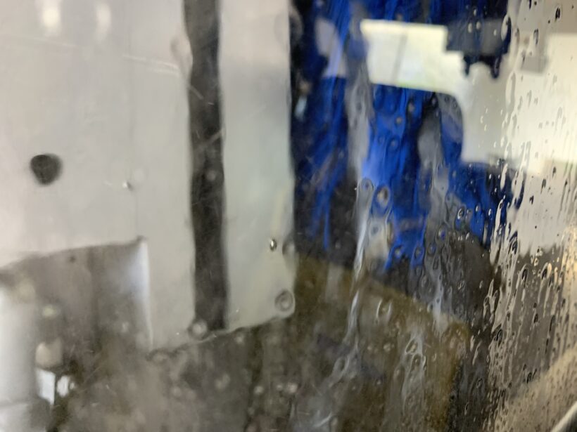しばらくすると…洗車の泡が…出てきました。洗い流せていないのか…。窓の内側のとこ、ガードがついてるとこ、あそこまではブラシも届かんのか…ちょっと残念。あそこが一番厄介ですよね〜…蜘蛛の巣が…とれたかな。