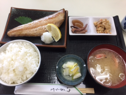 焼き魚定食は日替わりのようでホッケでした。(800円)えびのお味噌汁もおいしい…。ごはんとお味噌汁はおかわりできます。