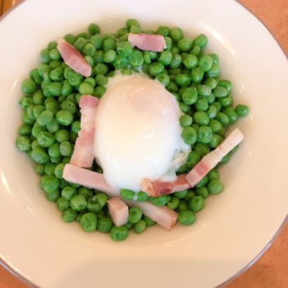 サイゼリヤのメニューの一つです。グリーンピースが大量でした!!温玉ってとてもおいしいです。