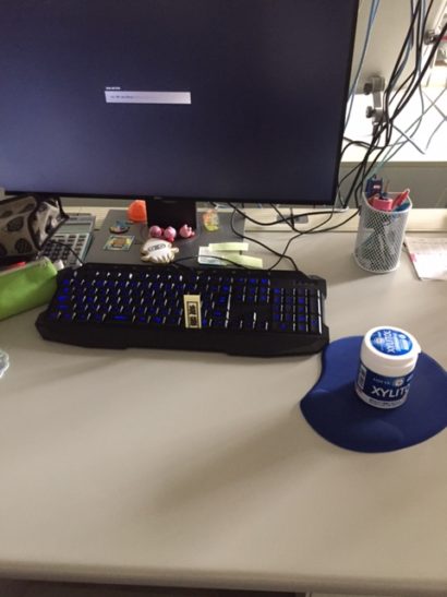 マウスパッドの上にはマウスではなく、キシリトールガム。そして地味に隠されているマウス。そしてキーボードの上には