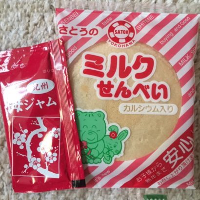 個人的に駄菓子で外せない、ミルクせんべいと梅ジャムです。すっぱくて、ミルクせんべいはマイルドでおいしい。組み合わせが神なのでオヌヌメのお菓子です。