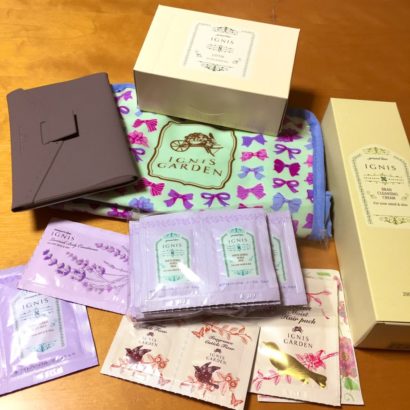 中身はスケジュール帳、クレンジング、ポーチ、コットン、化粧水&乳液5日分、他ヘアケアでした。