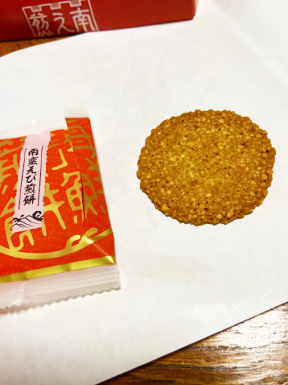 通常版は南蛮えびの甘みたっぷりで、せんべいですが「小麦粉」でできているので不思議な感じがします。しょっぱい感じではありません。