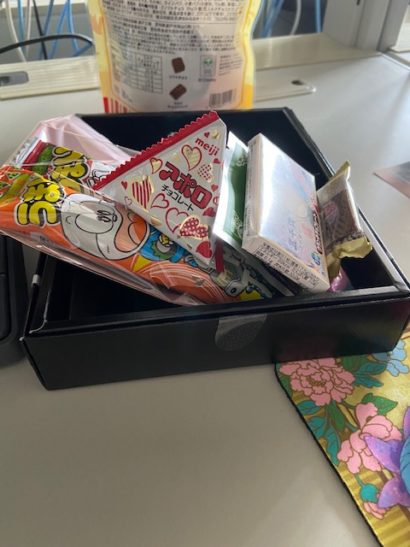箱いっぱいにお菓子をいただきうれしいです!まるで気分はサイン会のプレゼントボックスでした。