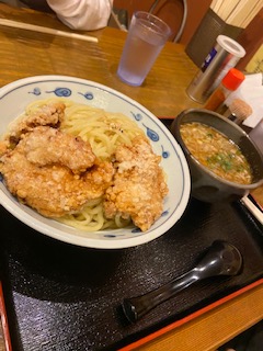 からあげオンザつけ麺!!この組み合わせはさすがにギルティなのでは!?お隣とのコラボメニューだった気がします。