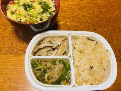 おかずはきのこ類の炒めものと、ピーマンと糸こんにゃくのなにかです。ヘルシーすぎます。カロリーどこ行ったのやら…。