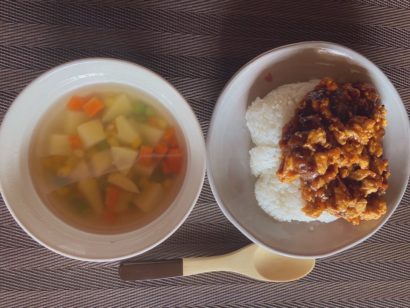 スープはホウレンソウとたまごのスープです。これもインスタント。