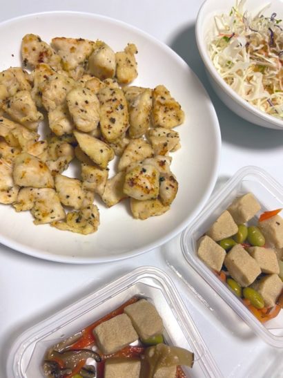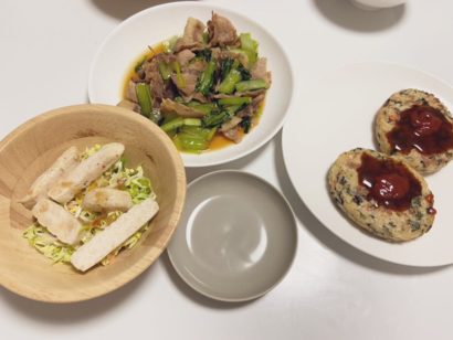小松菜と豚肉の炒め物と、サラダチキンを入れたサラダと惣菜の豆腐ハンバーグです。