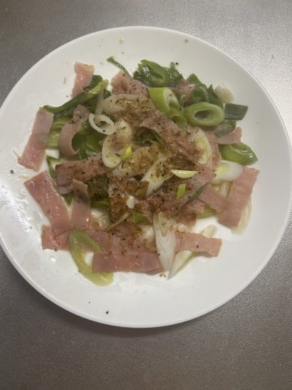 長ネギとベーコンを白だしでレンチンした料理です。かつおぶし振りかけました。