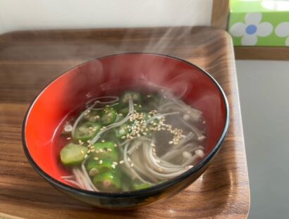 あ、今朝は早起きしたので生姜スープを作りました!具材がエノキとオクラのみの低予算バージョンです。