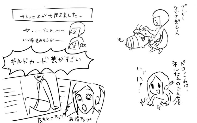 アンジーはうまいので、あまり力つきません。でも冷たいです。次ガロン行こうと言うと一人で行けと断られます。そのくせ「おとぎゃわさんはまだ刺激が足りないんだろう?ききキリン行こう」と言って来るので、キリンクエの巻き添え食らったサトゥニスがもれなく力つきます。サトゥニスには刺激的すぎた…。