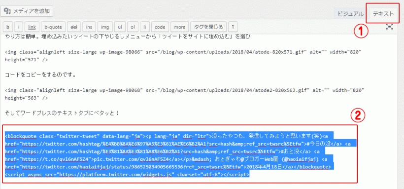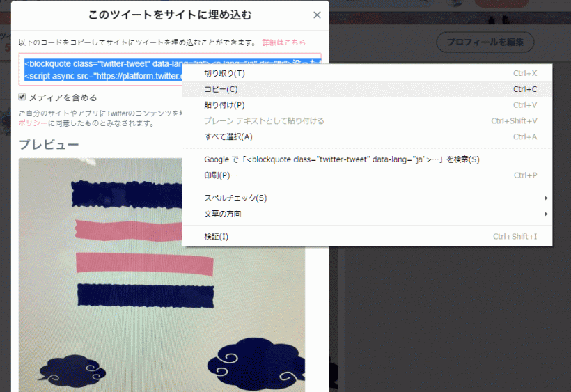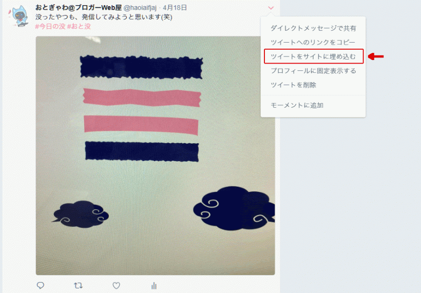 やり方は簡単。埋め込みたいツイートの下やじるしメニューから「ツイートをサイトに埋め込む」を選び