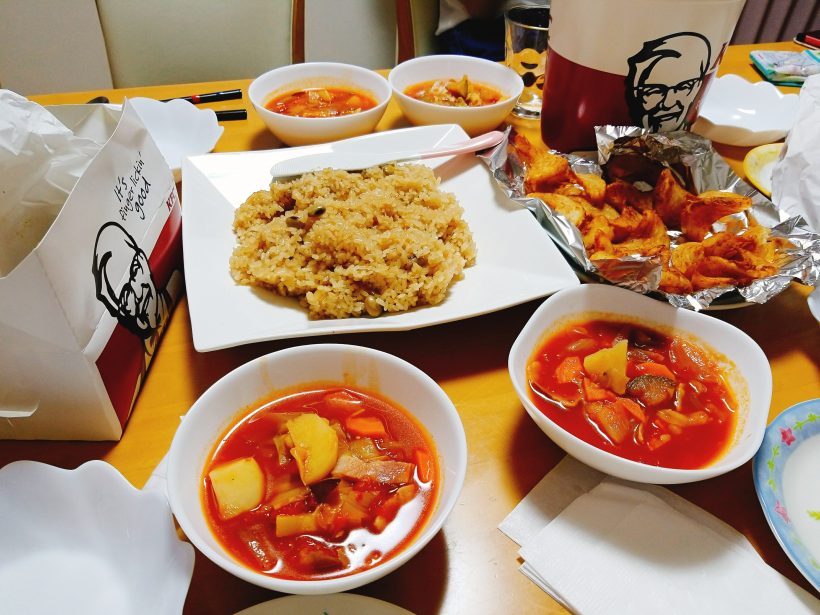 妹のリクエストのケンタッキーとしょうゆおこわ、そしてサラダ代わり(笑)のミネストローネです。
