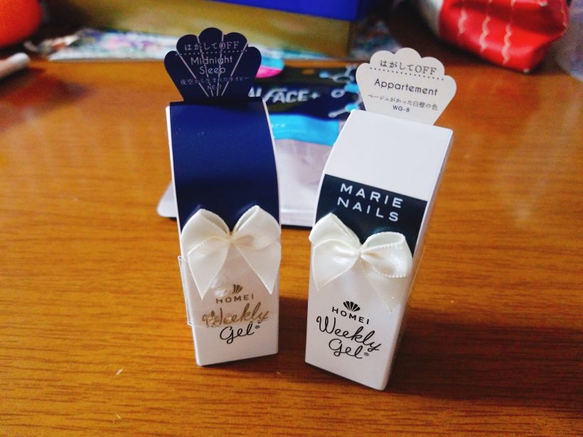 ウィークリージェル2本と、後ろに写りこんでいるパックです。もともと右の白い方のジェルが欲しかっただけなんですが、見てたらネイビーも欲しくなってしまい、ちょびっとだけついてたおまけに後押しされて買ってしまいました。意志が弱い…