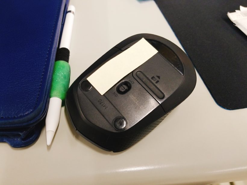 うまい具合に小さい付箋でマウスの赤外線部分?を塞いでいます。うっかりはりついちゃったのかな?と思わせるやり口、きたない!!