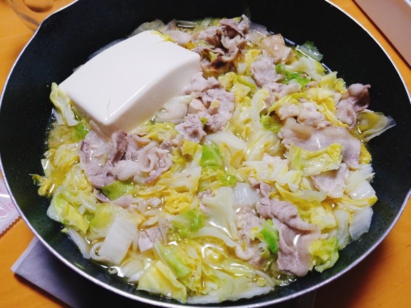 かさましにネギともやしも入れました。が、それでも4人分の適量がわからなくて、食べた途中からキャベツと豆腐と肉を無理やり追加したのがこちらです…。なんだか味もそっけもなさそうになってしまった…( ˇωˇ )