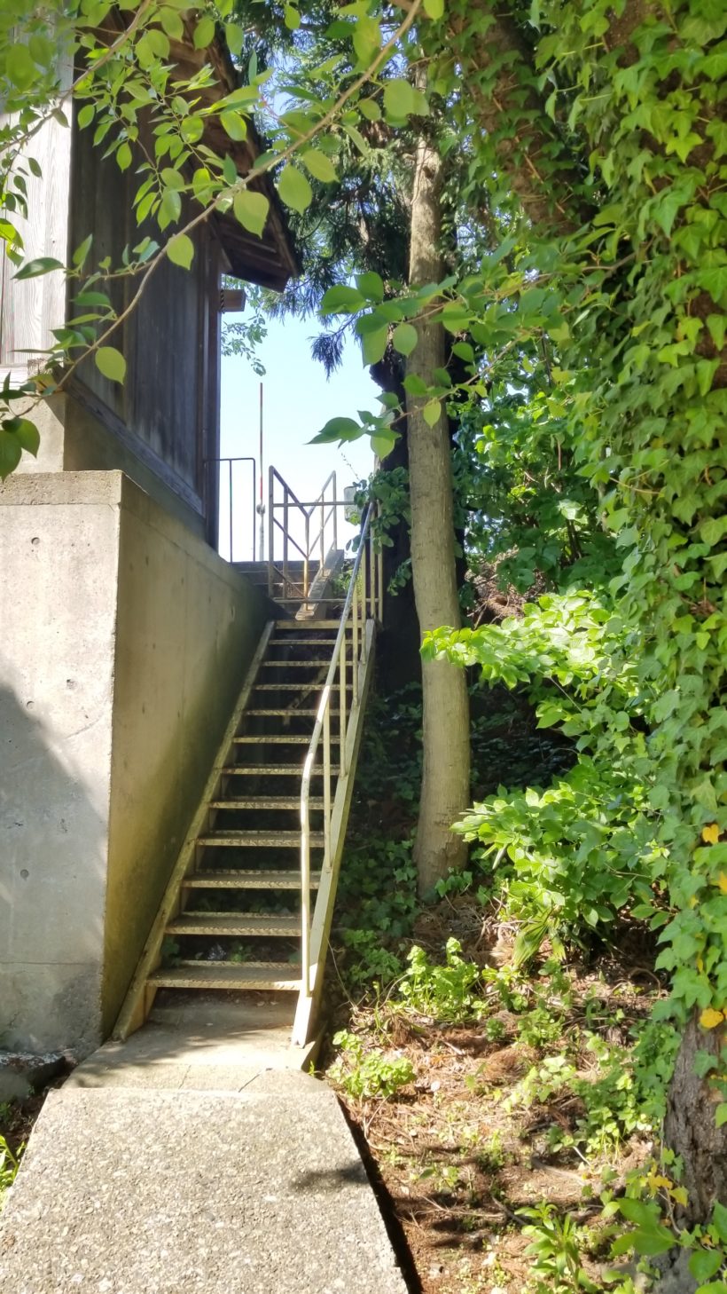 晴れた空と緑のコントラストと秘密基地みたいな狭い階段が良い!
