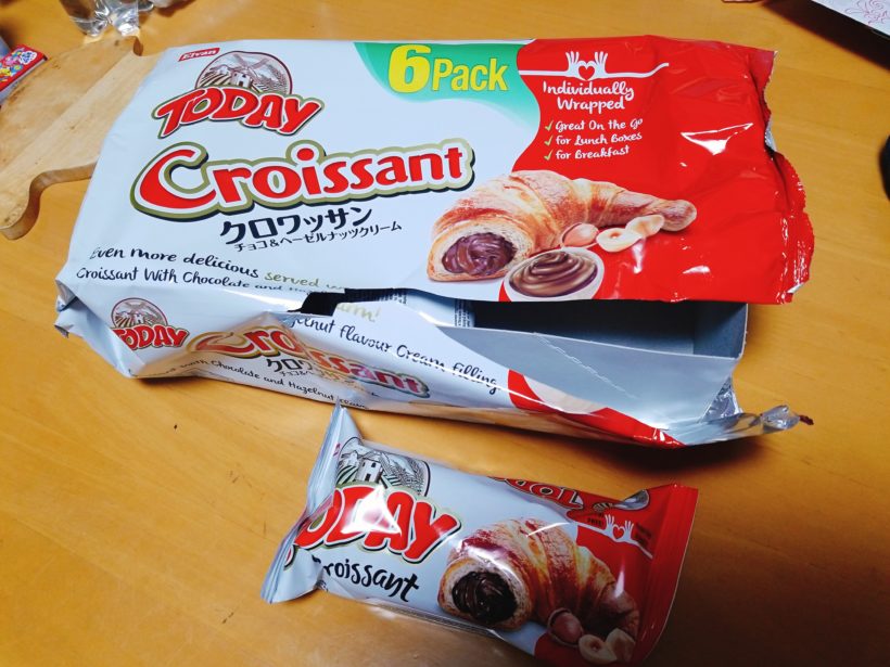 こんなかんじで手のひらより少し大きいくらいのチョコクリームクロワッサンが、なんと6つも入って380円ちょいでした!亀ジャの2階の雑貨屋で買いました。