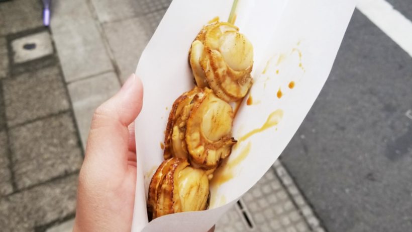 つづいて食べたのはホタテの串焼きです。お肉の串はよく見ますが、貝類の串は寺泊の方でないとあまり見かけないのでおもわず買っちゃいました。