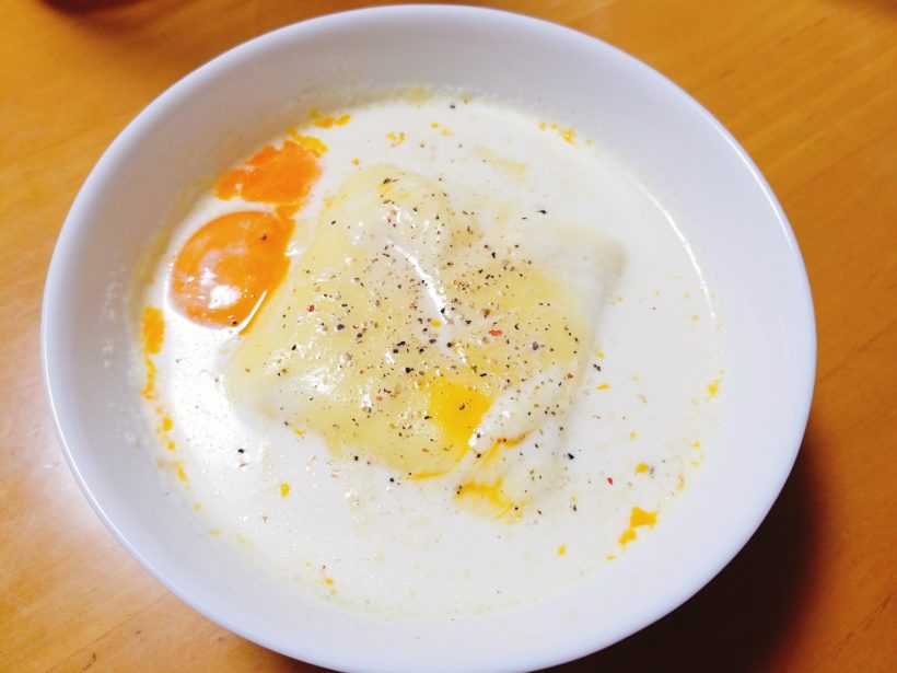 次はちゃんと豆乳で、ベーコンも入れて卵黄も真ん中に落として作ろうと思います…( ˇωˇ )