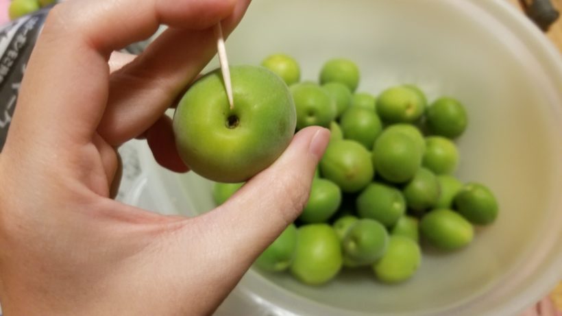 つまようじで⬆の黒いヘタの部分をほじくりだし、傷がない綺麗なものは梅干しに、傷ありのものは梅酒や梅ジュースにします!