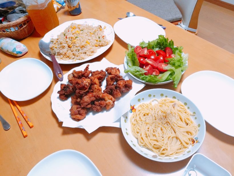 妹はトマトが大好きなのでギリギリ彩りはありますが、基本的に高カロリーで炭水化物もりもりですね…(笑)