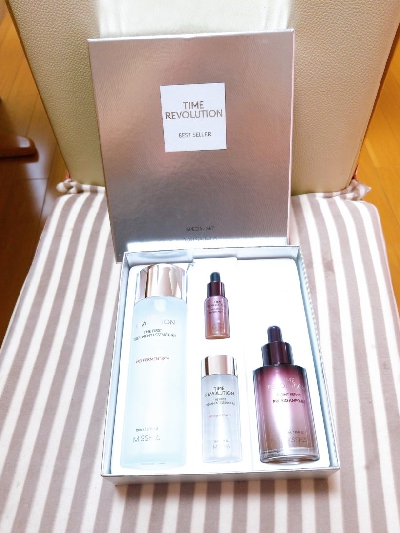 ミシャのタイムレボリューションシリーズ(?)のブースター化粧水&美容液のセットです。Amazonで大体5000円で買えました!元値は倍くらいするのでかなりお得です。