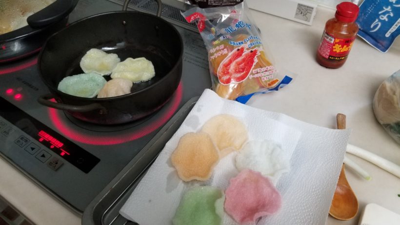 夕飯はキムチ鍋だったのですが、その調理と同時進行でおかずとばかりに揚げられていくせんべいたち…。