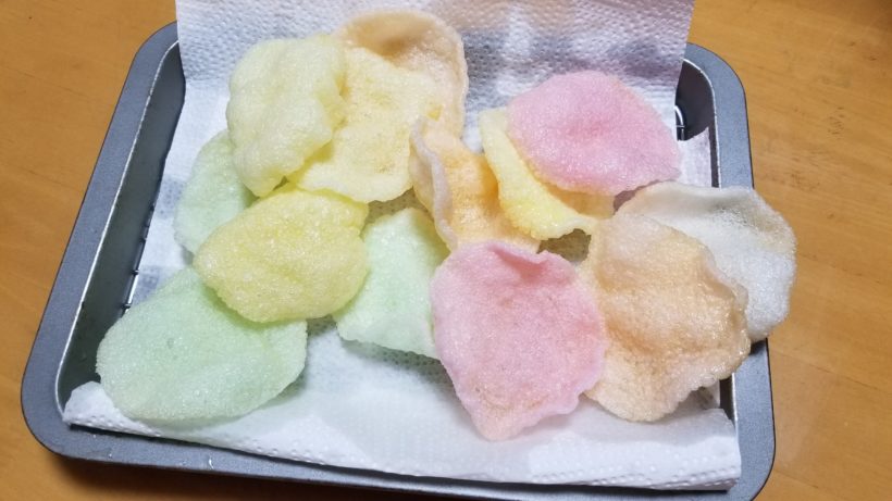 こちらは父がKALDIで買ってきたもので、半透明のプラスチックみたいな円盤を高温の油でサッと上げると、このようにふわっとしたえびせんになるという代物です。ほんとに一瞬でふわふわの見た目になるのが面白い〜!