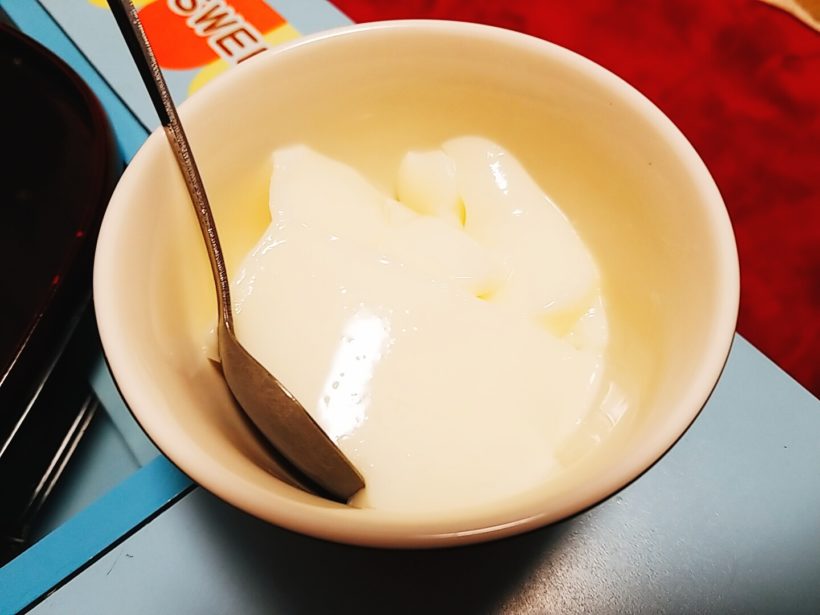 パッケージの説明図では牛乳パックから杏仁豆腐がズルルン…と出てくるような書かれ方をしてあるのですが、実際はなかなか出てこなかったのでスプーンで食べたい量を掬い出しました。