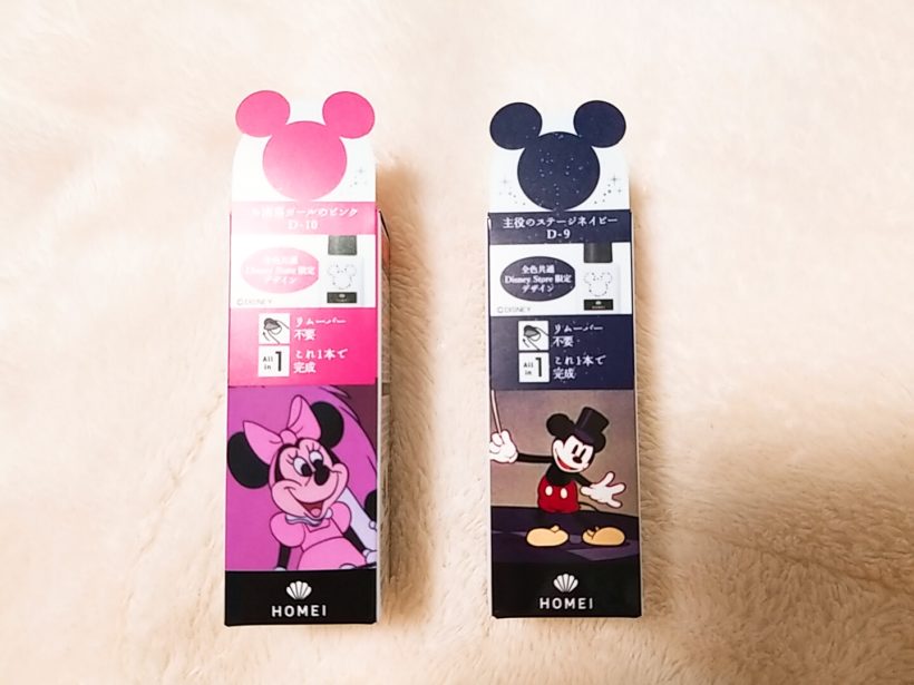 購入したのは濃いネイビーにラメがチラチラ光って素敵なD-9と、透明感があるショッキングピンクのD-10。奇しくもミッキーとミニーの色でした。