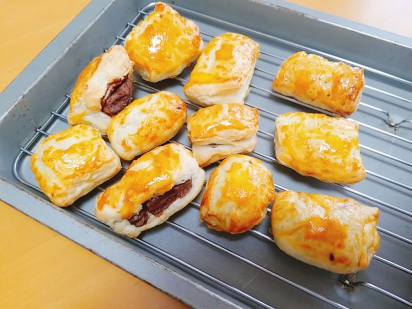ということで、今日の手作りおやつはプチチョコパイ!解凍したパイシートをめん棒で伸ばし、一口サイズに割った板チョコを1粒ずつくるんで、200℃の余熱したオーブンで15分焼きました。