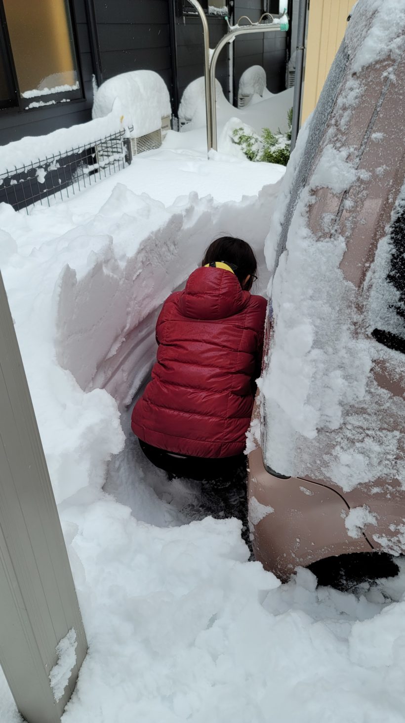 昼頃に雪をなんとか落として、車をやっと前に出したら、大人がすっぽり隠れるくらいの隙間が出来ていてこれまたなんだか楽しくなってしまいました。