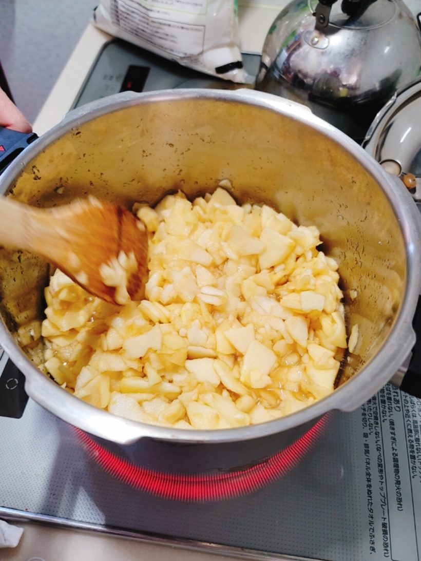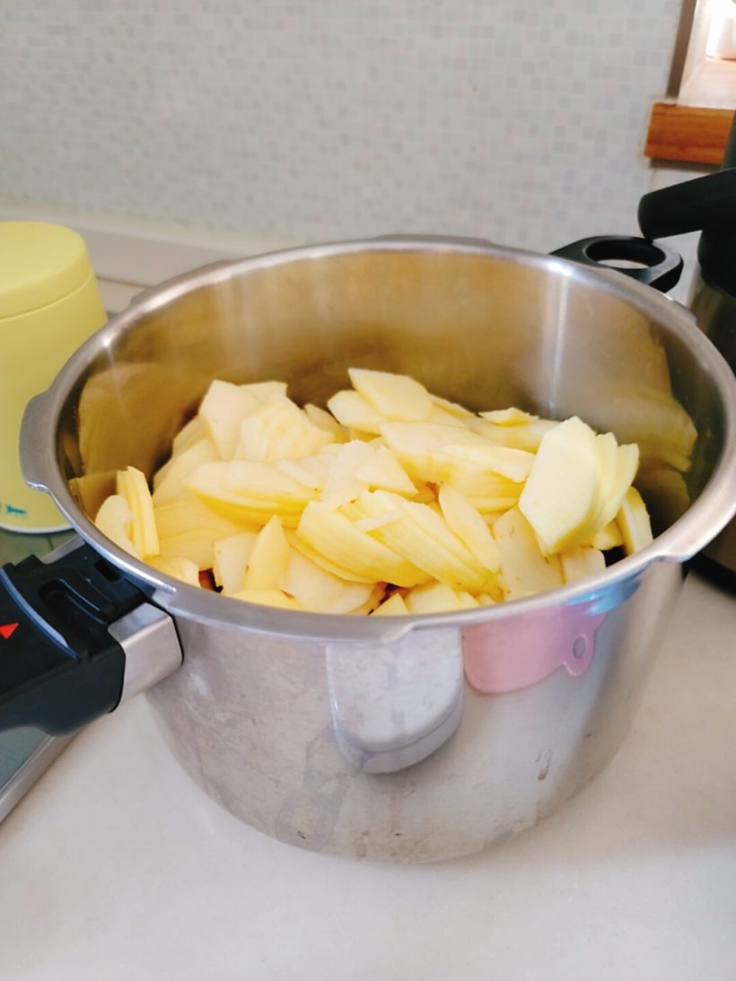 でっかい圧力鍋にこんもり入れられた薄切りのリンゴはなかなかの圧巻です。家でこんなに剥かれたリンゴ見たことないかも笑