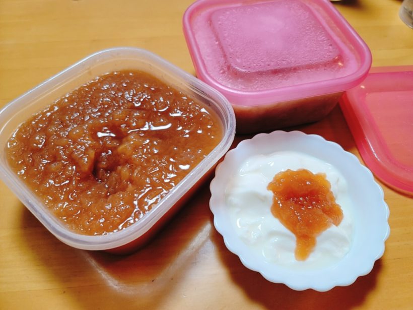 1リットル近く出来たので、半分は冷凍してあります。実物はわりと茶色ですが、りんごの風味や甘さ、食感がちゃんと残ってておいしい!! 写真のように、ヨーグルトに入れて食べるのが最高です。