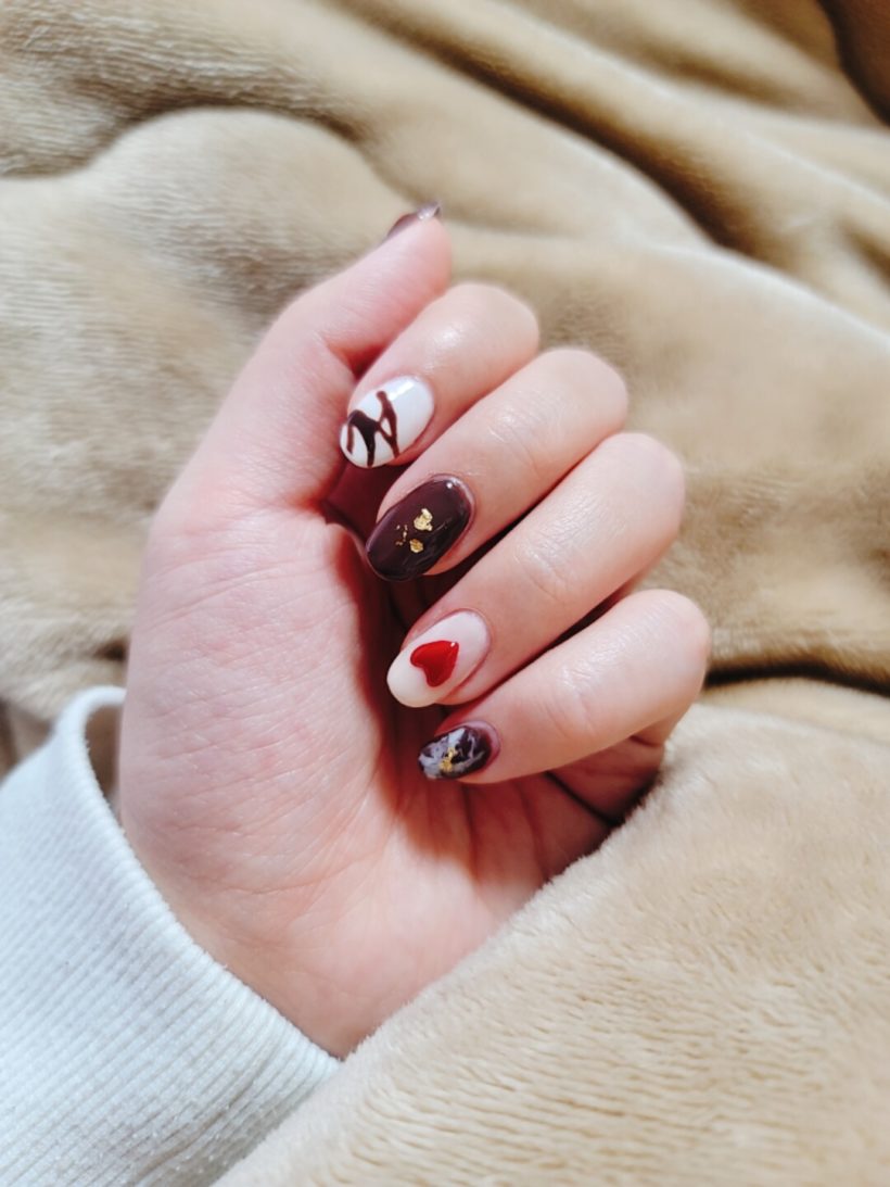 チョコレート色はセリアジェルネイルのレッドとマスタードとブラックを混ぜて作りました!なかなかちゃんとチョコ色に出来たのでは?