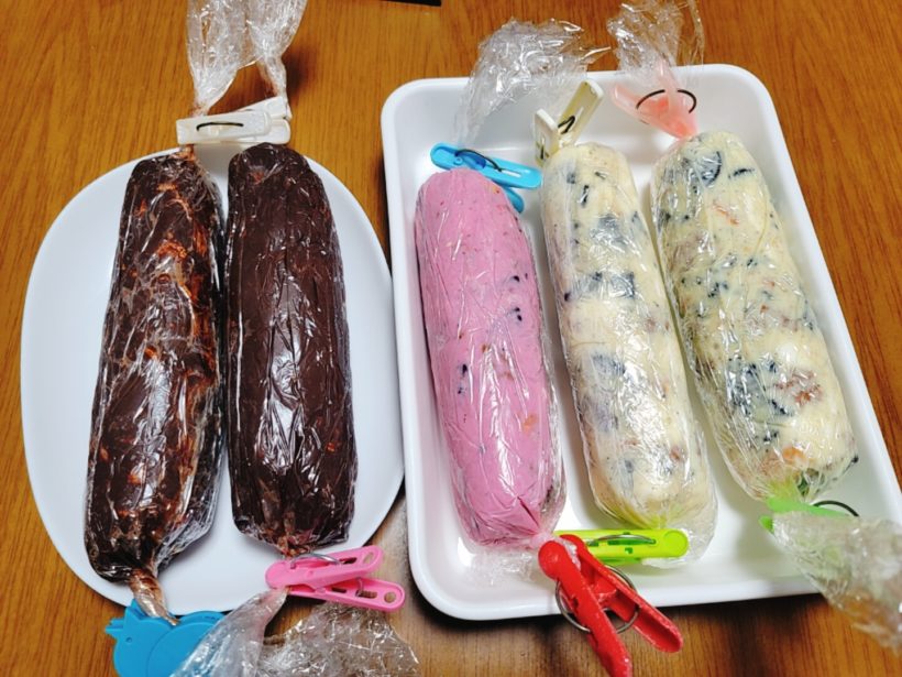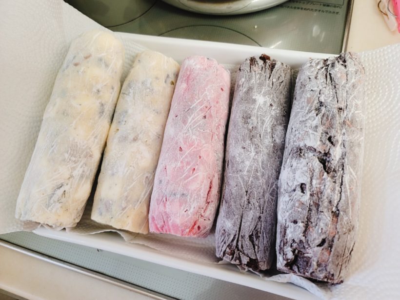 溶かしたチョコに生クリームと砕いたクッキーやビスケット、マシュマロなどをたっぷり混ぜ込んで筒状にして固めたら完成です。