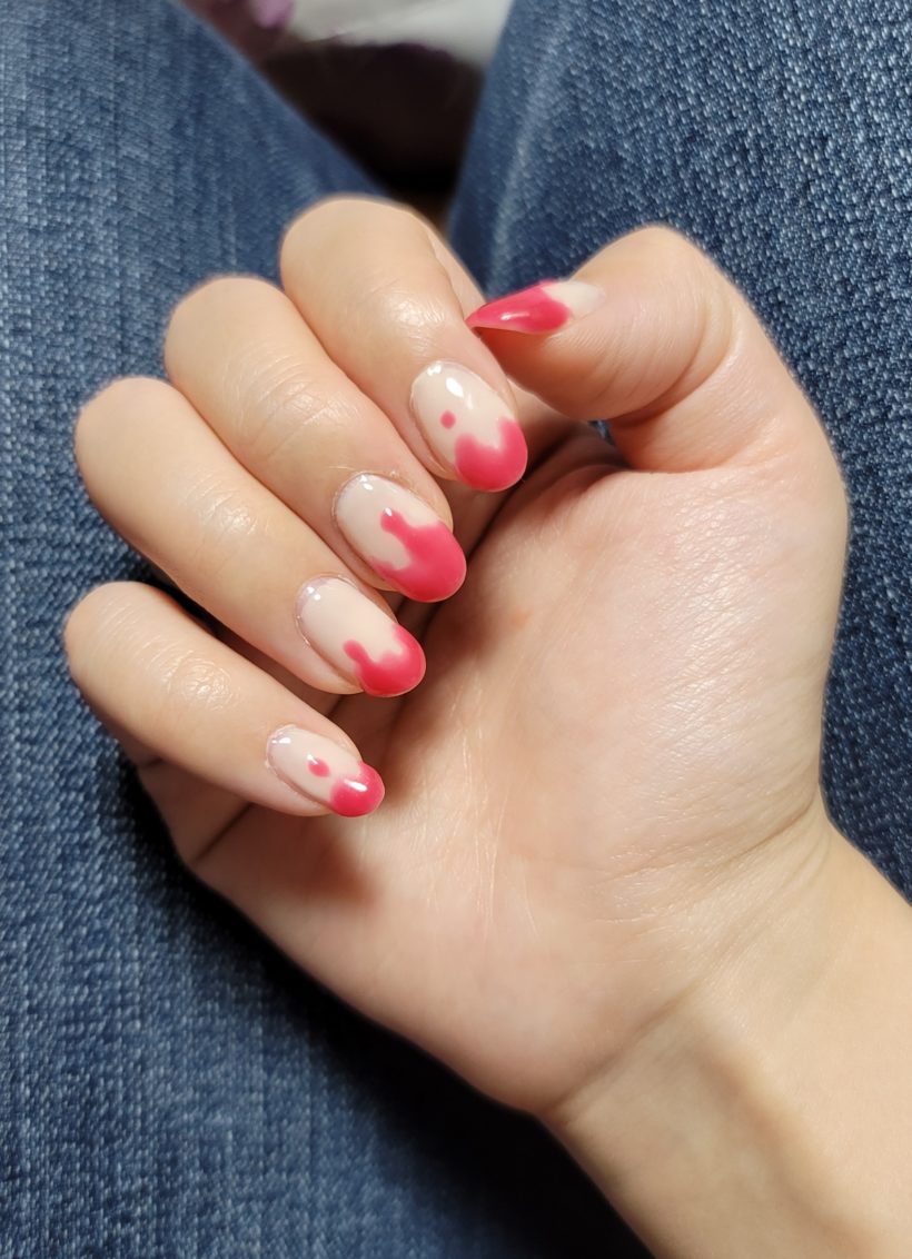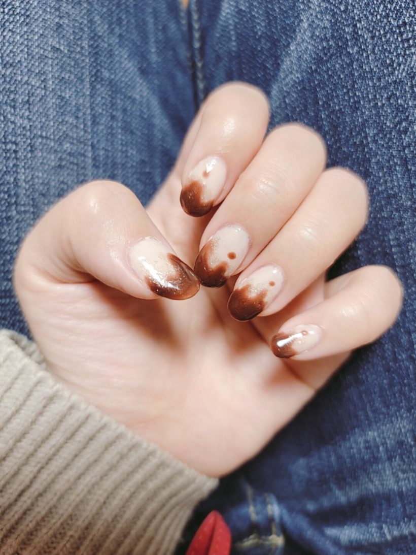 今度は左右色違いに。バニラアイスにとろ〜っとソースをかけたようなイメージのお遊びデザインです。服とのコーディネートはめちゃめちゃ難しいタイプの爪ですが、もうこの際気にしないことにします。それなりに気に入る出来になったので( ˇωˇ )