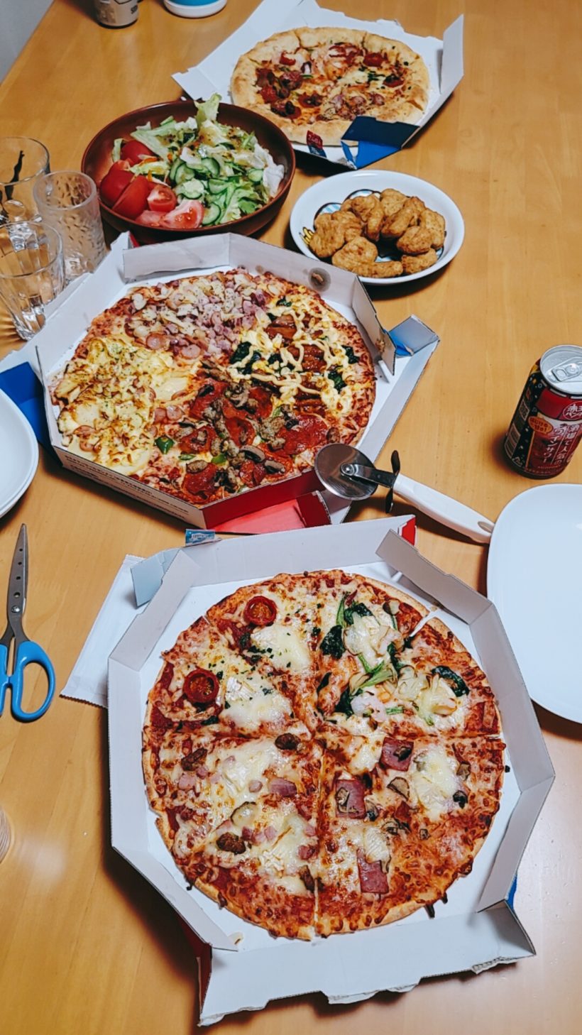 どこかに食べに行くのもちょっと気後れしたので、今年は持ち帰りでピザパーティーになりました。