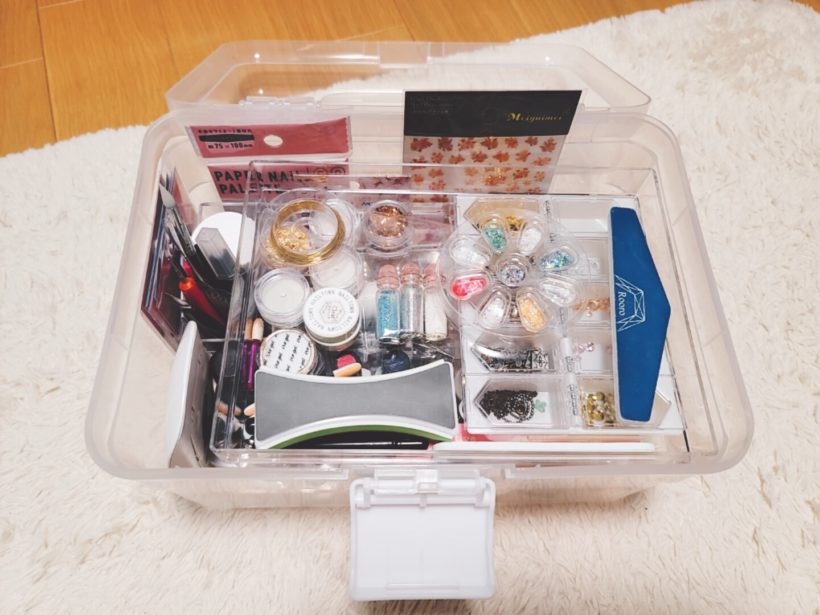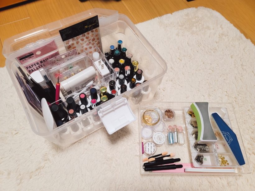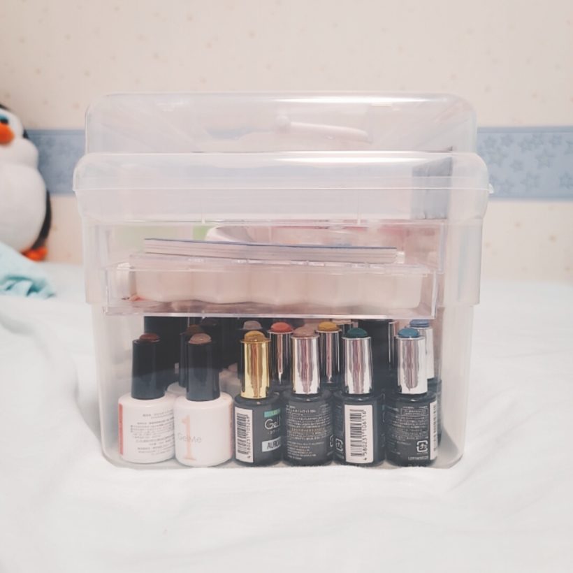 ジェルネイルのボトルだけでなくケア用品、パーツ、シール、筆、ledライト、それ用のモバイルバッテリー、コード、充電アダプター……などなどあらゆるものをひとつにまとめることができました。