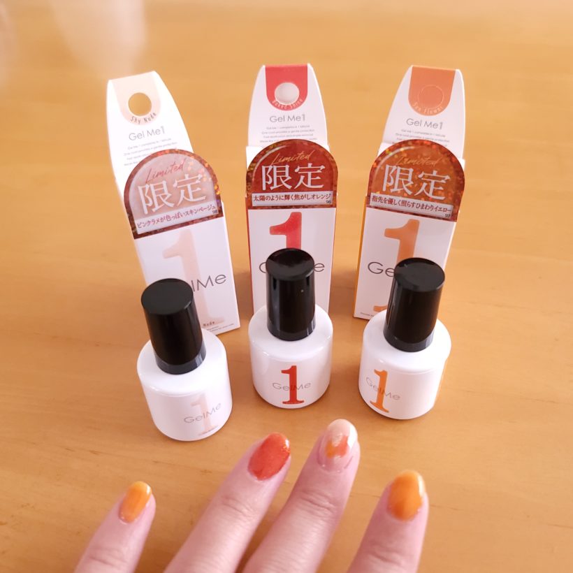 ゴールドラメが輝くパッキリしたオレンジ、シアーな山吹色と思いきやよく見ると微細なパールが上品なイエロー、ピンクの偏光パールが今風なシアーベージュと、どれも全部大好きなカラー。眺めているだけでテンションが上がってきますし、夏真っ盛りなカラーでカラダが夏にナル!