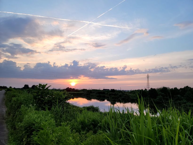 飛行機雲、空の色、夕日、川の映り込み……どれも個人的にグッとくる要素です!