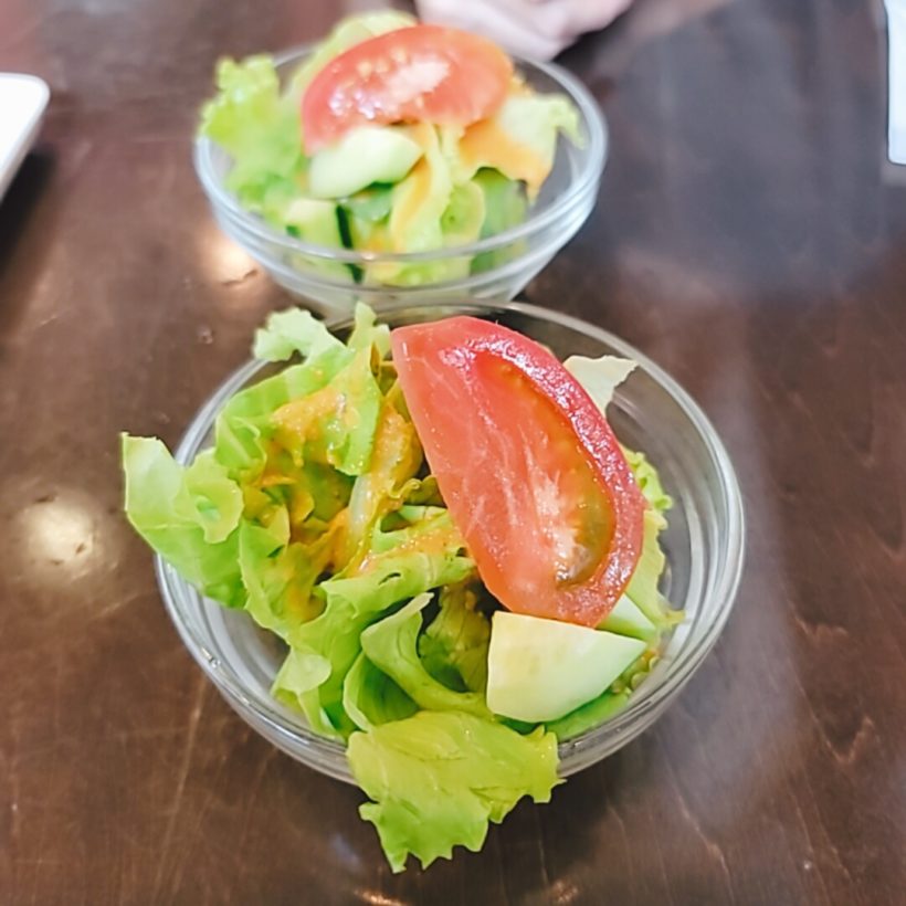 サラダは自家製の『リンゴドレッシング』。味噌の風味(※多分)を感じる新感覚の激ウマドレッシングだったので秒で無くなりました笑