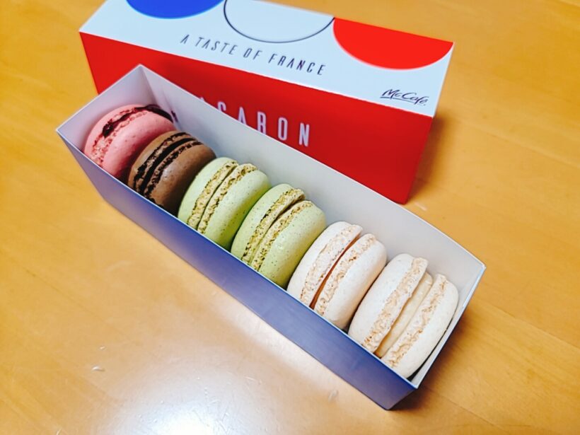 箱の配色はトリコロールカラーでいい意味でマックっぽさが薄いです。見た目はめちゃめちゃオーソドックスなマカロンですね。
